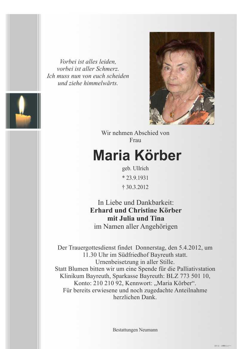 Der Trauergottesdienst findet Donnerstag, den 5.4.2012, um 11.30 Uhr im Südfriedhof Bayreuth statt. Urnenbeisetzung in aller Stille. Statt Blumen bitten wir um eine Spende für die Palliativstation Klinikum Bayreuth, Sparkasse Bayreuth: BLZ 773 501 10, Konto: 210 210 92, Kennwort: „Maria Körber“.