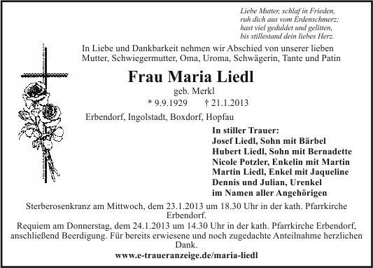 Requiem am Donnerstag, dem 24.1.2013 um 14.30 Uhr in der kath. Pfarrkirche Erbendorf, anschließend Beerdigung. Für bereits erwiesene und noch zugedachte Anteilnahme herzlichen Dank.
