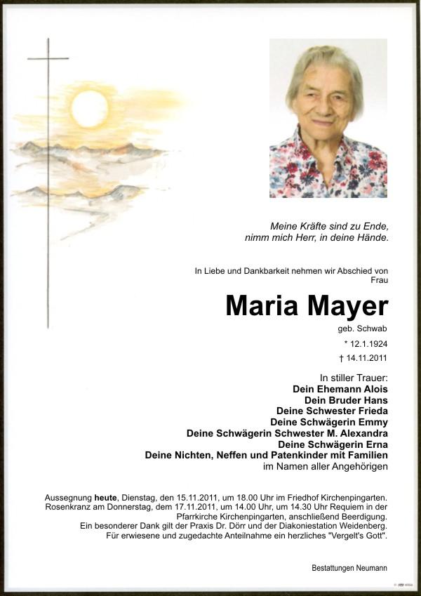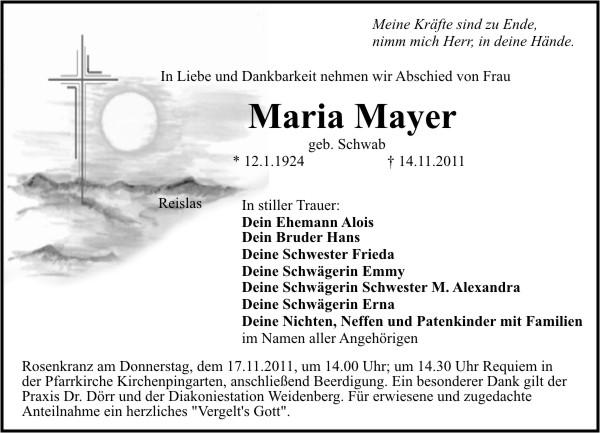 Aussegnung, heute, 15.11.2011 um 18.00 Uhr auf dem Friedhof Kirchenpingarten. Rosenkranz am Donnerstag, dem 17.11.2011, um 14.00 Uhr; um 14.30 Uhr Requiem in der Pfarrkirche Kirchenpingarten, anschließend Beerdigung. Ein besonderer Dank gilt der Praxis Dr. Dörr und der Diakoniestation Weidenberg. Für erwiesene und zugedachte Anteilnahme ein herzliches "Vergelt's Gott".