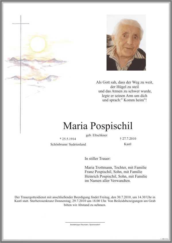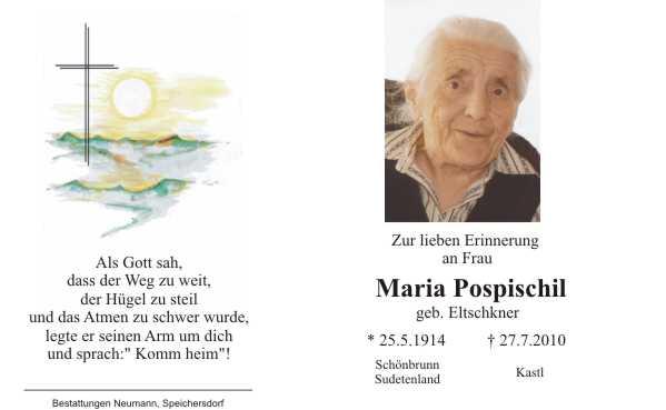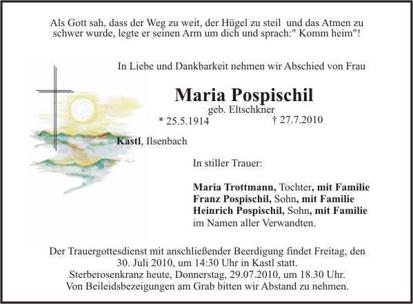 Die Beisetzung findet am Freitag, 30.07.2010 um 14:30 Uhr auf dem Friedhof in Kastl statt.