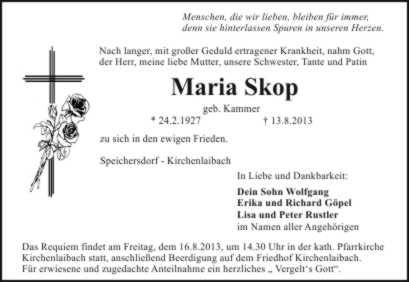 Aussegnung am Mittwoch, dem 14.8.2013, um 18.00 Uhr auf dem Friedhof Kirchenlaibach. Das Requiem findet am Freitag, dem 16.8.2013, um 14.30 Uhr in der kath. Pfarrkirche Kirchenlaibach statt, anschließend Beerdigung auf dem Friedhof Kirchenlaibach.