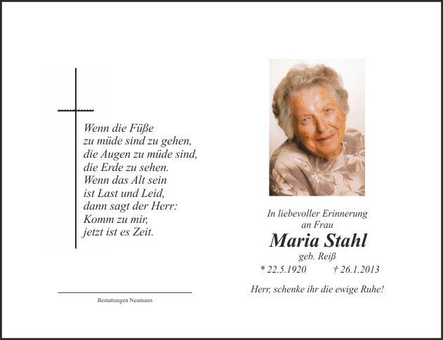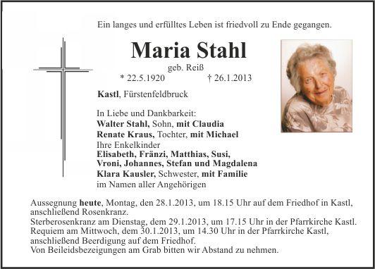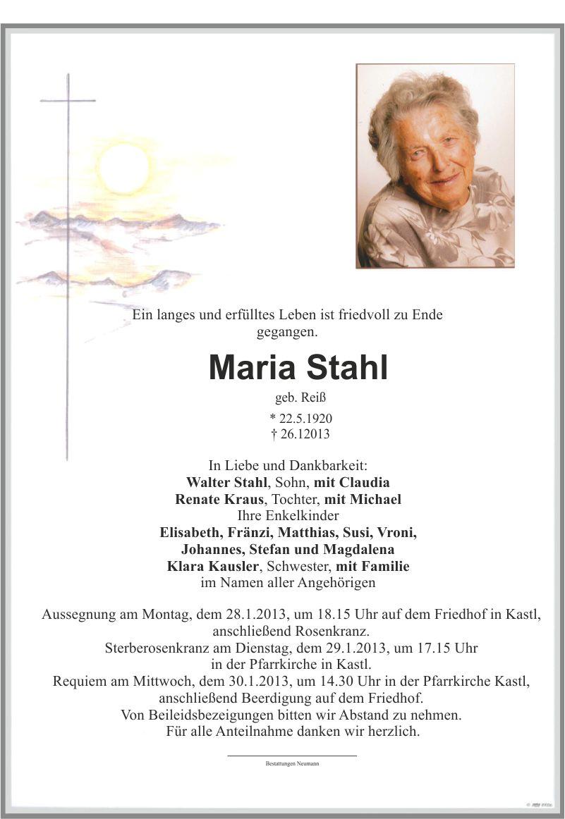 Sterberosenkranz am Dienstag, dem 29.1.2013, um 17.15 Uhr in der Pfarrkirche Kastl. Requiem am Mittwoch, dem 30.1.2013, um 14.30 Uhr in der Pfarrkirche Kastl, anschließend Beerdigung auf dem Friedhof.