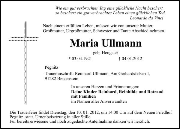 Die Trauerfeier findet Dienstag, den 10. 01. 2012, um 14.00 Uhr auf dem Neuen Friedhof Pegnitz statt. Urnenbeisetzung in aller Stille.