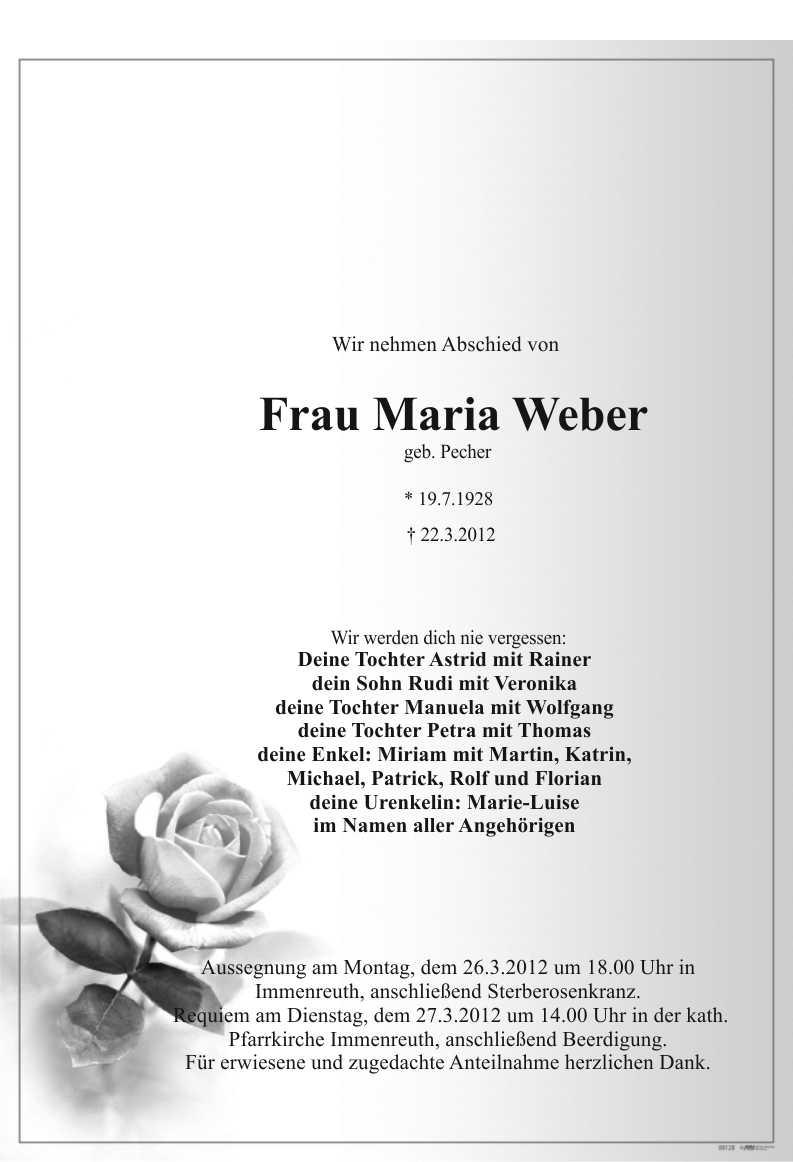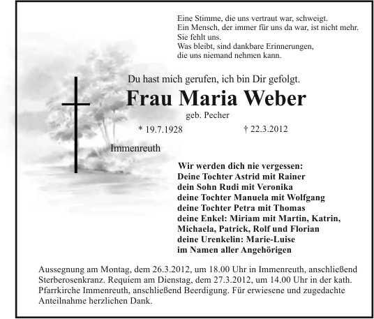 Aussegnung am Montag, dem 26.3.2012, um 18.00 Uhr in Immenreuth, anschließend Sterberosenkranz. Requiem am Dienstag, dem 27.3.2012, um 14.00 Uhr in der kath. Pfarrkirche Immenreuth, anschließend Beerdigung. Für erwiesene und zugedachte Anteilnahme herzlichen Dank.