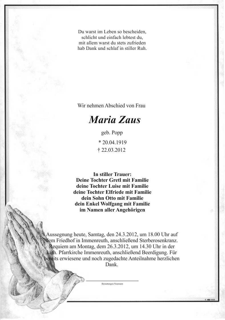 Aussegnung heute, Samstag, den 24.3.2012, um 18.00 Uhr auf dem Friedhof in Immenreuth, anschließend Sterberosenkranz. Requiem am Montag, dem 26.3.2012, um 14.30 Uhr in der kath. Pfarrkirche Immenreuth, anschließend Beerdigung.