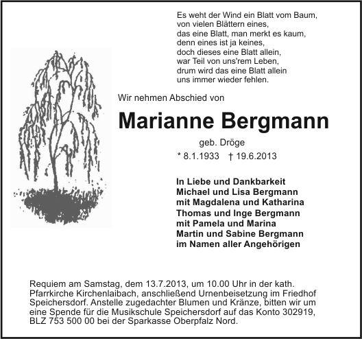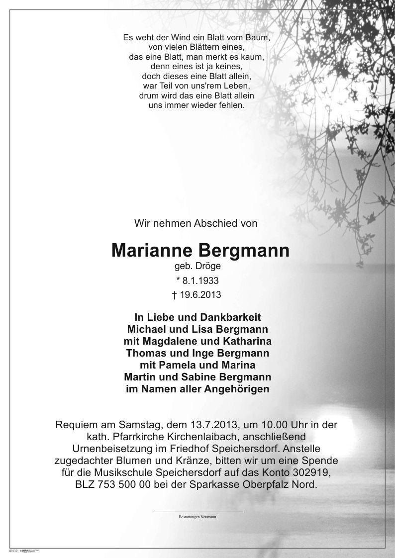 Requiem am Samstag, dem 13.7.2013, um 10.00 Uhr in der kath. Pfarrkirche Kirchenlaibach, anschließend Urnenbeisetzung im Friedhof Speichersdorf. Anstelle zugedachter Blumen und Kränze, bitten wir um eine Spende für die Musikschule Speichersdorf auf das Konto 302919, BLZ 753 500 00 bei der Sparkasse Oberpfalz Nord.