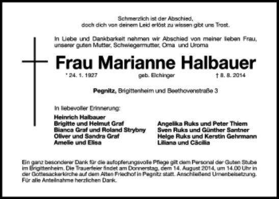 Die Beisetzung findet am Donnerstag, 14.08.2014 um 14:00 Uhr auf dem Friedhof Alter Friedhof in Pegnitz statt.