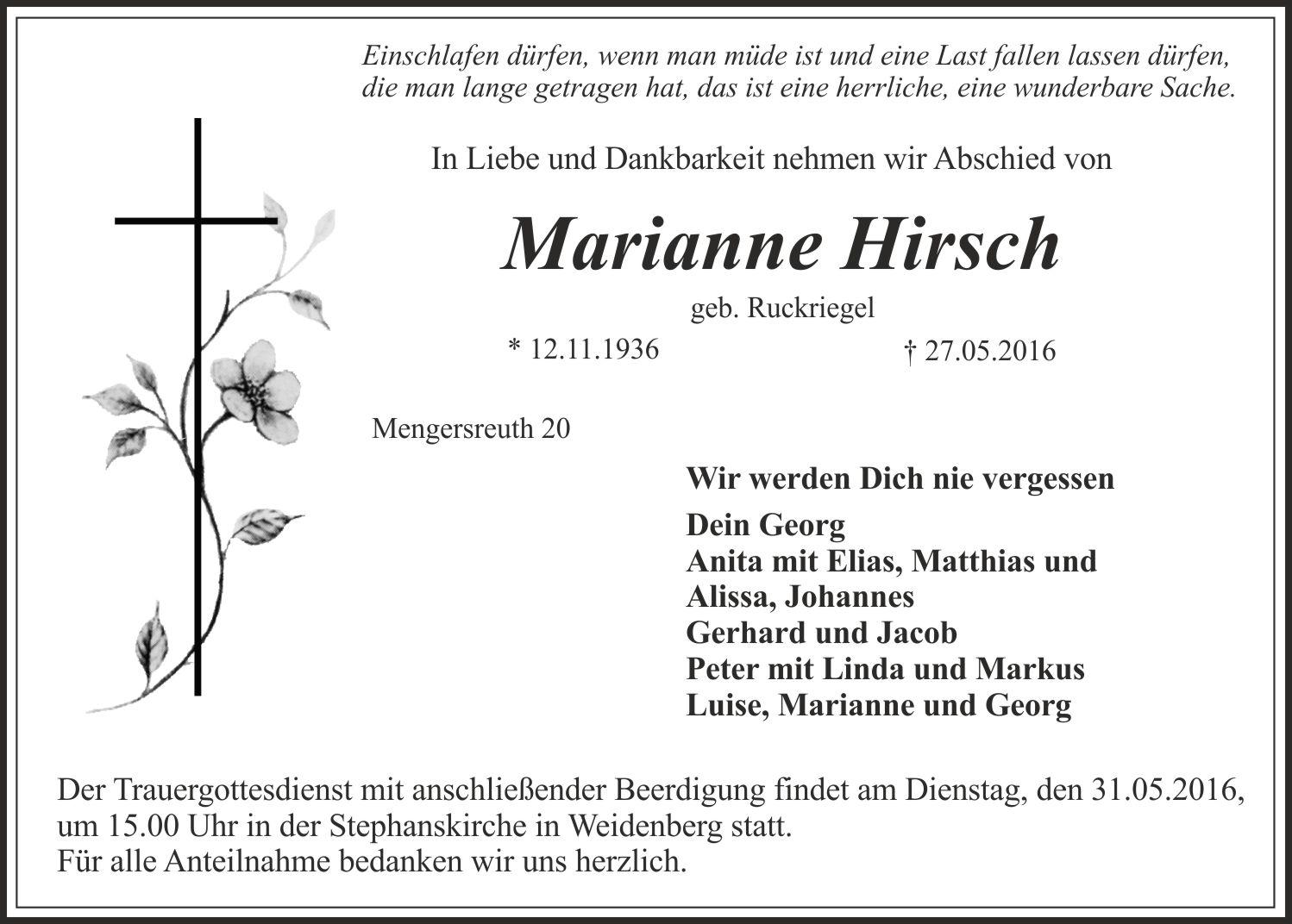 Der Trauergottesdienst mit anschließender Beerdigung findet am Dienstag, den 31.05.2016, um 15.00 Uhr in der Stephanskirche in Weidenberg statt. Für alle Anteilnahme bedanken wir uns herzlich.