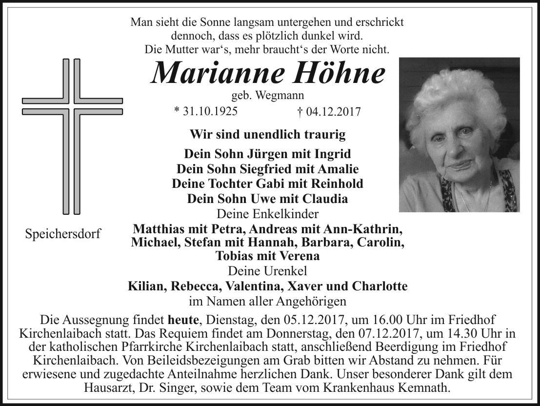 Die Aussegnung findet am Dienstag, den 05.12.2017, um 16.00 Uhr im Friedhof Kirchenlaibach statt. Das Requiem findet am Donnerstag, den 07.12.2017, um 14.30 Uhr in der katholischen Pfarrkirche Kirchenlaibach statt, anschließend Beerdigung im Friedhof Kirchenlaibach. Von Beileidsbezeigungen am Grab bitten wir Abstand zu nehmen. Für erwiesene und zugedachte Anteilnahme herzlichen Dank. Unser besonderer Dank gilt dem Hausarzt, Dr. Singer, sowie dem Team vom Krankenhaus Kemnath.