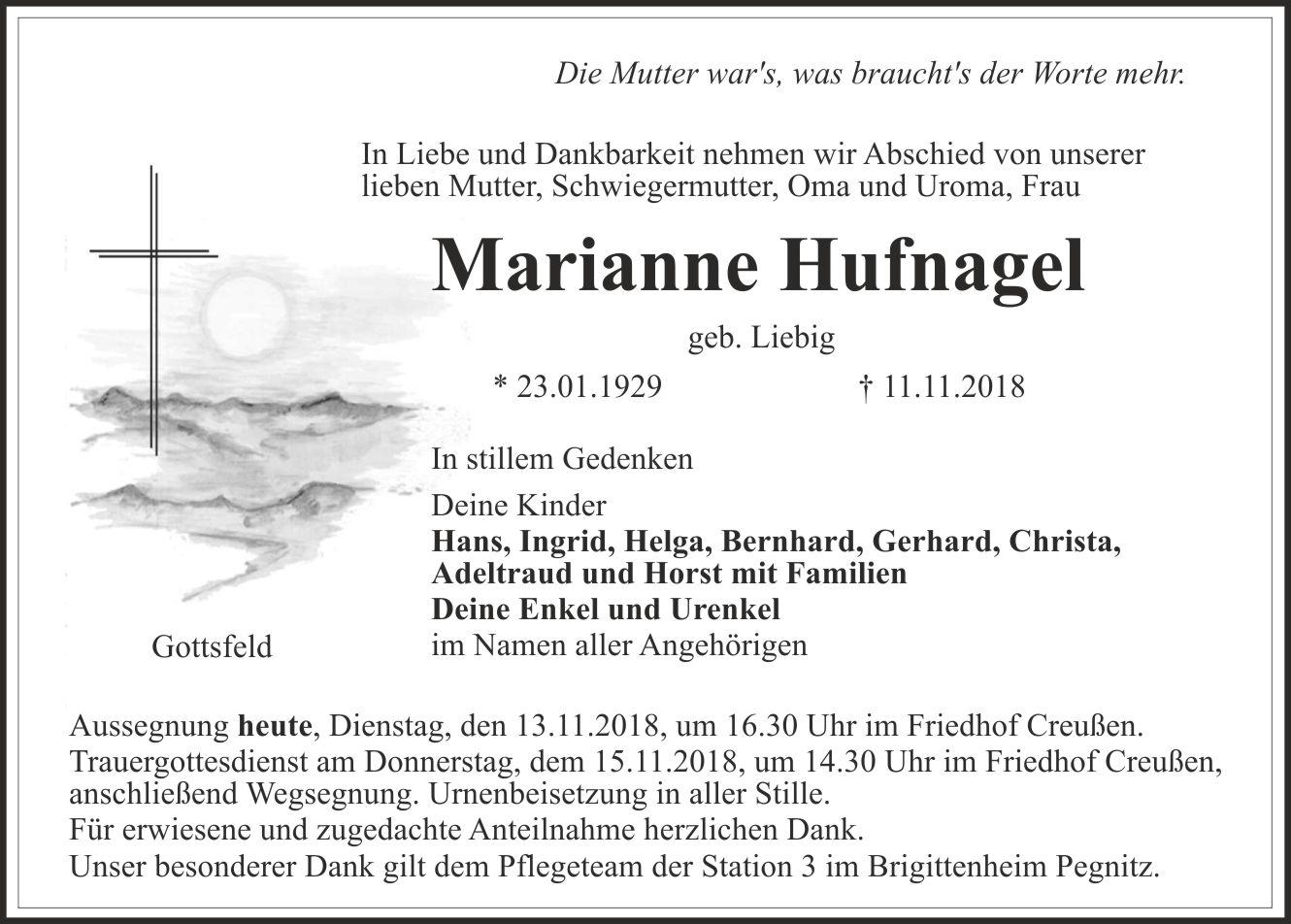 Aussegnung am Dienstag, dem 13.11.2018, um 16.30 Uhr im Friedhof Creußen. Trauergottesdienst am Donnerstag, dem 15.11.2018, um 14.30 Uhr im Friedhof Creußen, anschließend Wegsegnung. Urnenbeisetzung in aller Stille. Für alle Anteilnahme herzlichen Dank.