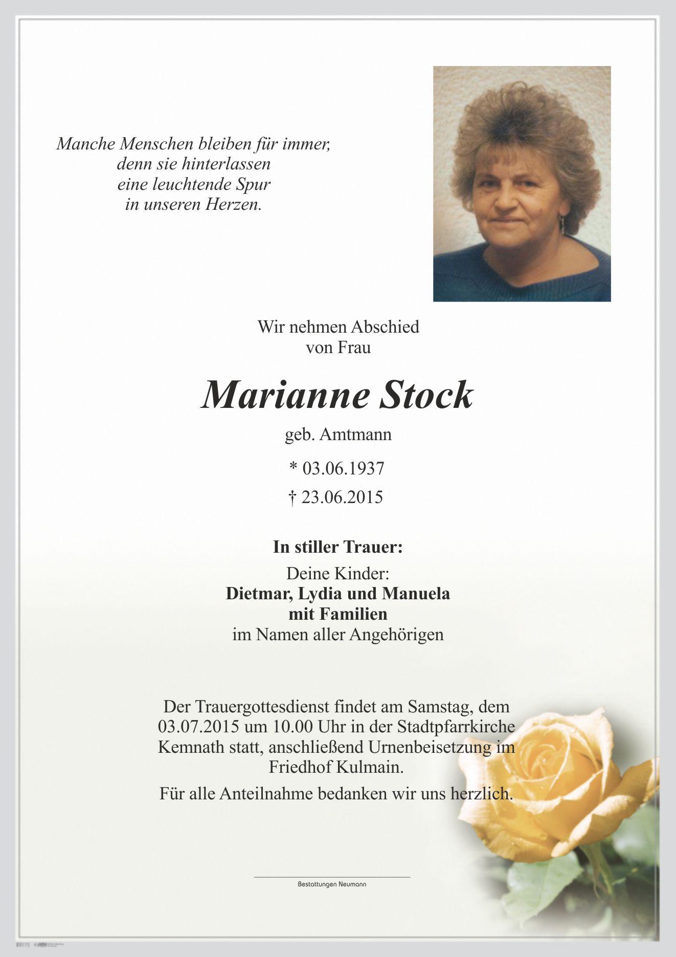 Der Trauergottesdienst findet am Samstag, dem 03.07.2015 um 10.00 Uhr in der Stadtpfarrkirche Kemnath statt, anschließend Urnenbeisetzung im Friedhof Kulmain.