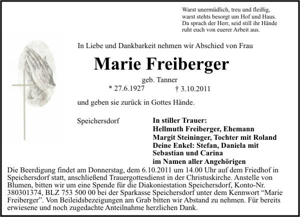 Die Beisetzung findet am Donnerstag, 06.10.2011 um 14:00 Uhr auf dem Friedhof in Speichersdorf statt.