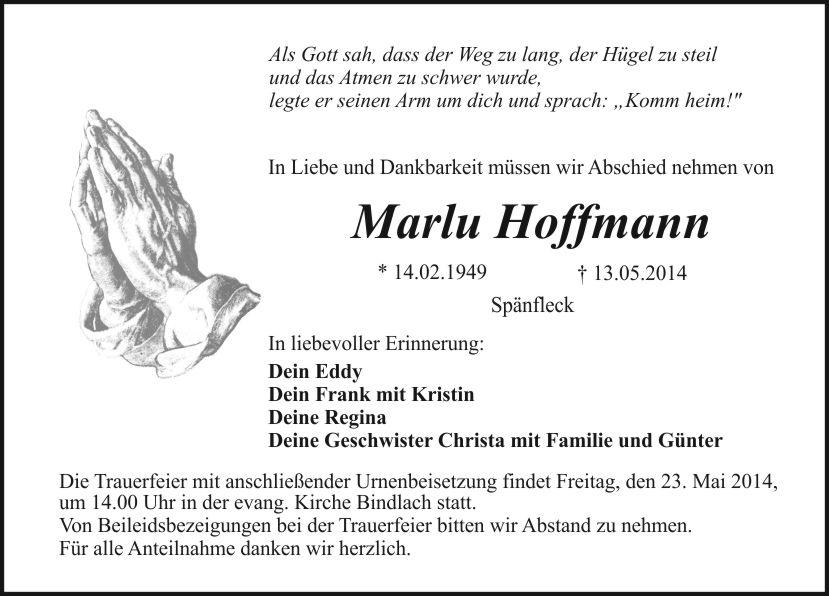 Die Trauerfeier mit anschließender Urnenbeisetzung findet Freitag, den 23. Mai 2014, um 14.00 Uhr in der evang. Kirche Bindlach statt.