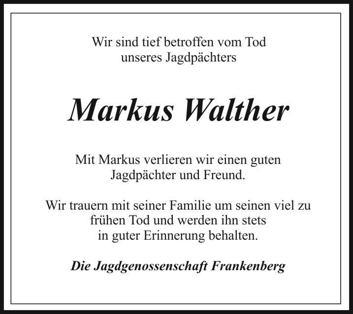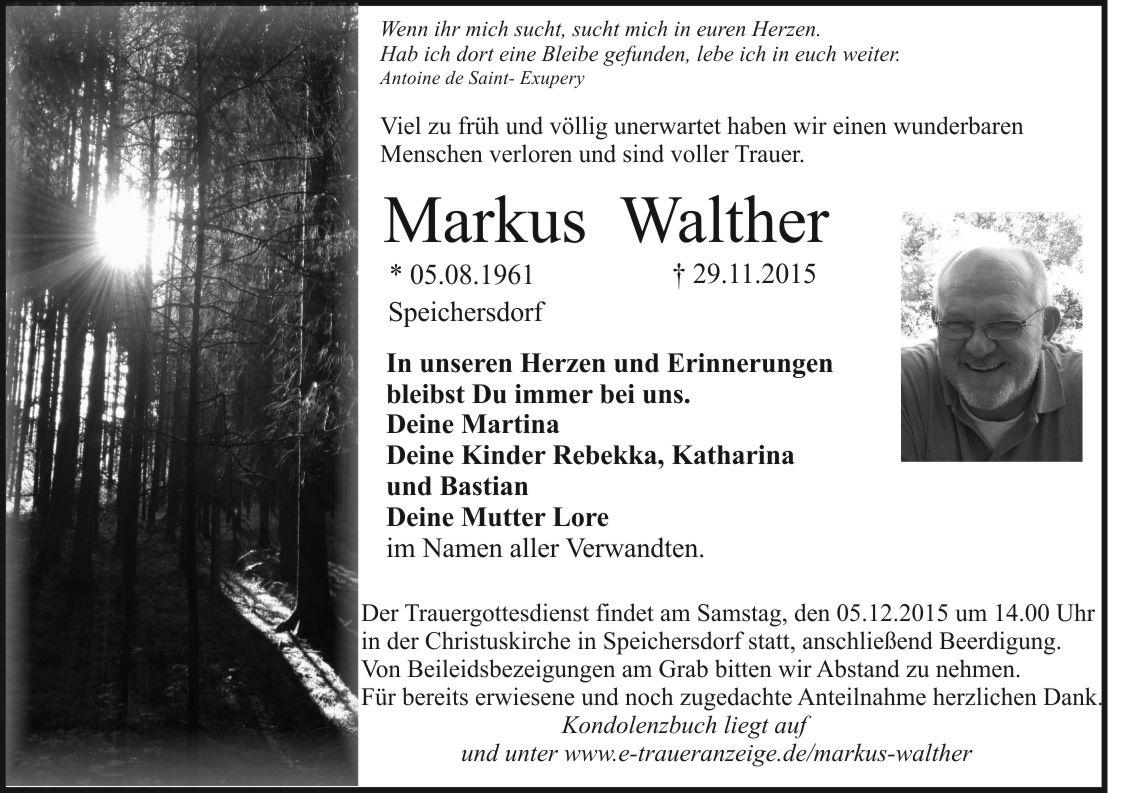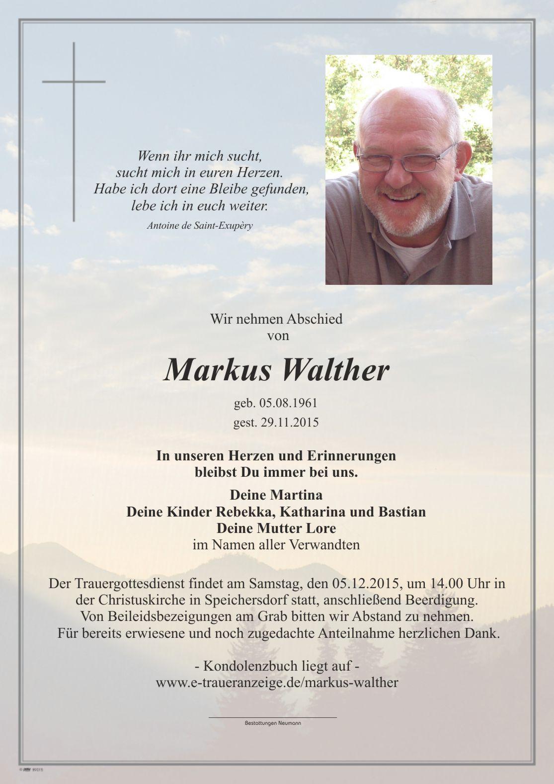 Liebe Familie Walther tief bestürzt habe ich die Nachricht vom Tod meines Kollegen und Freundes Markus erfahren. Noch letzte Woche haben wir mit einander telefoniert und uns fachlich ausgetauscht. Er war und ist ein wunderbarern Kollege. Ich wünsche Ihnen viel Kraft und einen starken Glauben für die nun kommende Zeit.