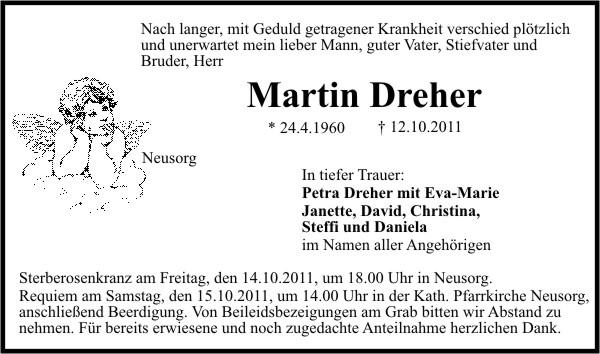 Requiem am Samstag, den 15.10.2011, um 14.00 Uhr in der Kath. Pfarrkirche Neusorg, anschließend Beerdigung. Von Beileidsbezeigungen am Grab bitten wir Abstand zu nehmen. Für bereits erwiesene und noch zugedachte Anteilnahme herzlichen Dank.