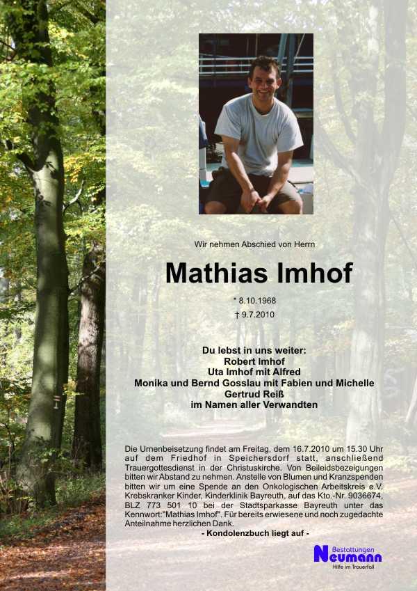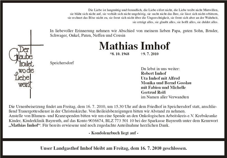Die Beisetzung findet am Freitag, 16.07.2010 um 15:30 Uhr auf dem Friedhof in Speichersdorf statt.
