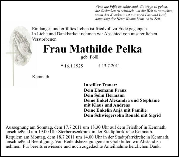 Aussegnung am Sonntag, den 17.7.2011, um 18.30 Uhr auf dem Friedhof in Kemnath, anschließend um 19.00 Uhr Sterberosenkranz in der Stadtpfarrkirche Kemnath.