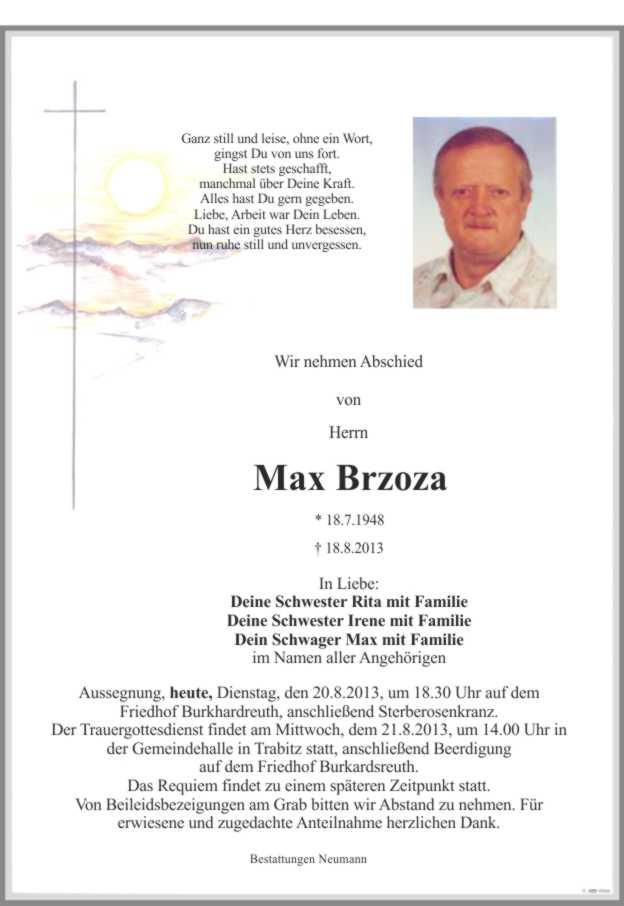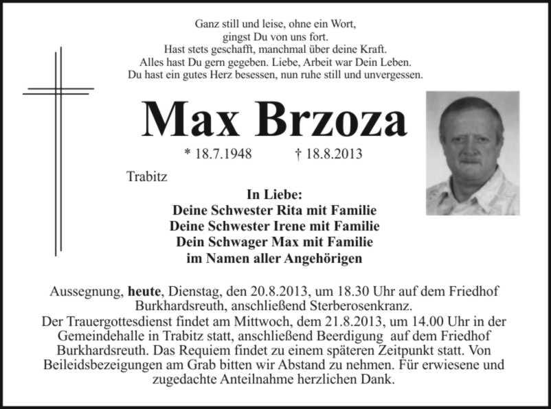 Der Trauergottesdienst findet am Mittwoch, dem 21.8.2013, um 14.00 Uhr in der Gemeindehalle in Trabitz statt, anschließend Beerdigung auf dem Friedhof Burkhardsreuth. Das Requiem findet zu einem späteren Zeitpunkt statt. Von Beileidsbezeigungen am Grab bitten wir Abstand zu nehmen. Für erwiesene und zugedachte Anteilnahme herzlichen Dank.