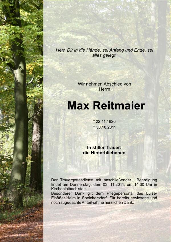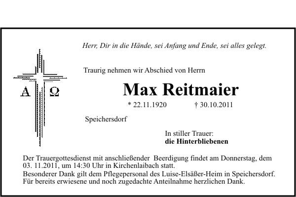 Der Trauergottesdienst mit anschließender Beerdigung findet am Donnerstag, dem 03. 11.2011, um 14.30 Uhr in Kirchenlaibach statt.