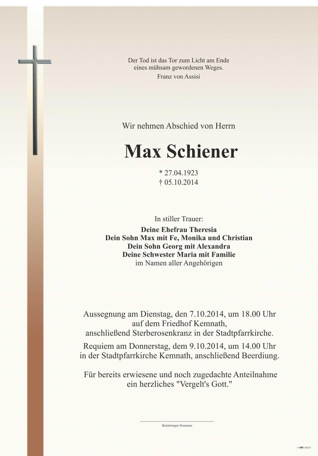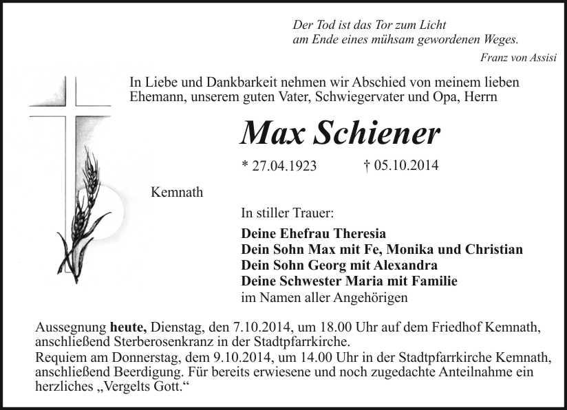 Requiem am Donnerstag, dem 9.10.2014, um 14.00 Uhr in der Stadtpfarrkirche Kemnath, anschließend Beerdigung. Für bereits erwiesene und noch zugedachte Anteilnahme ein herzliches „Vergelts Gott.“