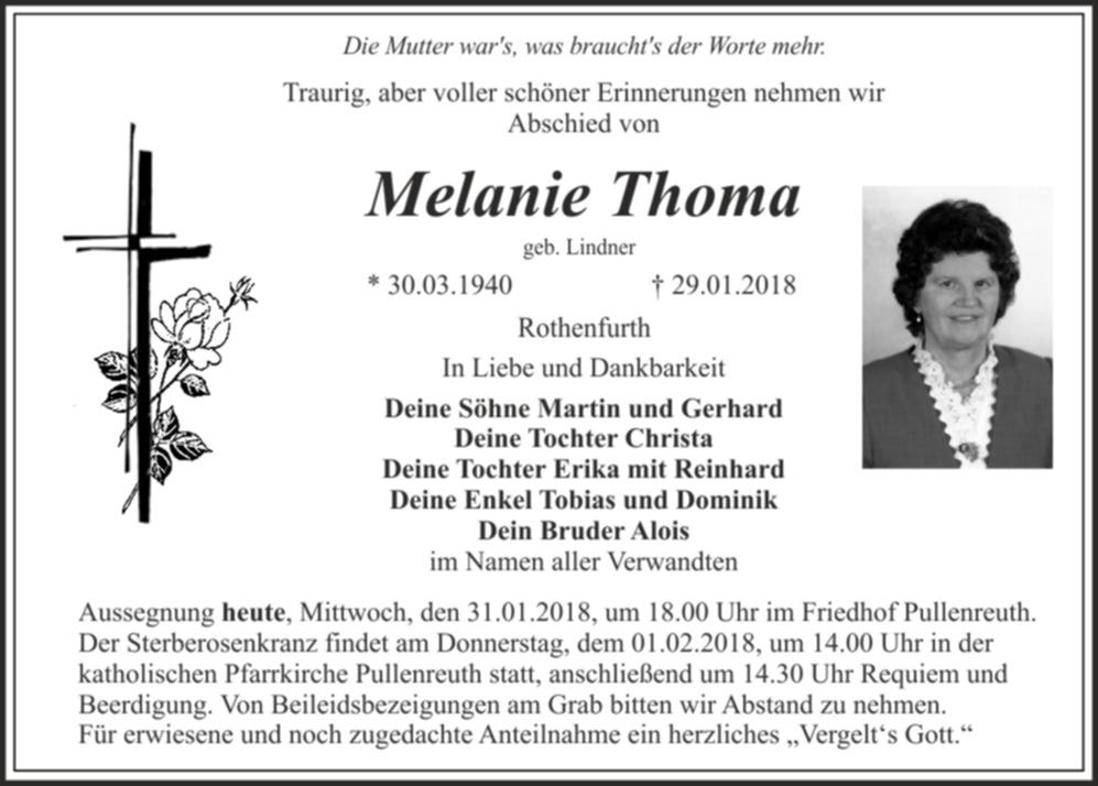 Aussegnung Mittwoch, den 31.01.2018, um 18.00 Uhr im Friedhof Pullenreuth. Sterberosenkranz am Donnerstag, den 01.02.2018, um 14.00 Uhr in der katholischen Pfarrkirche Pullenreuth, anschließend um 14.30 Uhr Requiem und Beerdigung. Von Beileidsbezeigungen am Grab bitten wir Abstand zunehmen. Für erwiesene und zugedachte anteilnahme ein herzliches "Vergelt's Gott".