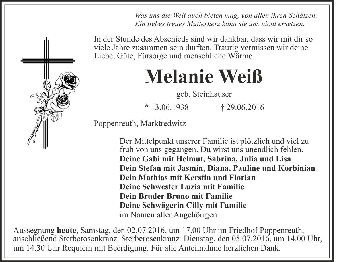 Aussegnung am Samstag, den 02.07.2016, um 17.00 Uhr im Friedhof Poppenreuth, anschließend Sterberosenkranz. Sterberosenkranz am Dienstag, den 05.07.2016, um 14.00 Uhr in Poppenreuth, anschließend 14.30 Uhr Requiem und Beerdigung. Für alle Anteilnahme herzlichen Dank.