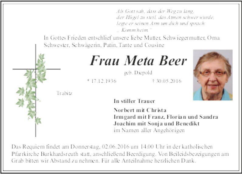 Liebe Familie Beer, mit großem Bedauern habe ich gelesen, dass Meta verstorben ist. Zu diesem schweren Verlust übermittle ich auf diesem Wege mein tiefempfundenes Beileid. Gerne erinnere ich mich an das letzte Treffen mit Meta in Kurbersdorf, bei dem auch Tante Emma aus Neustadt/Waldnaaab dabei war.