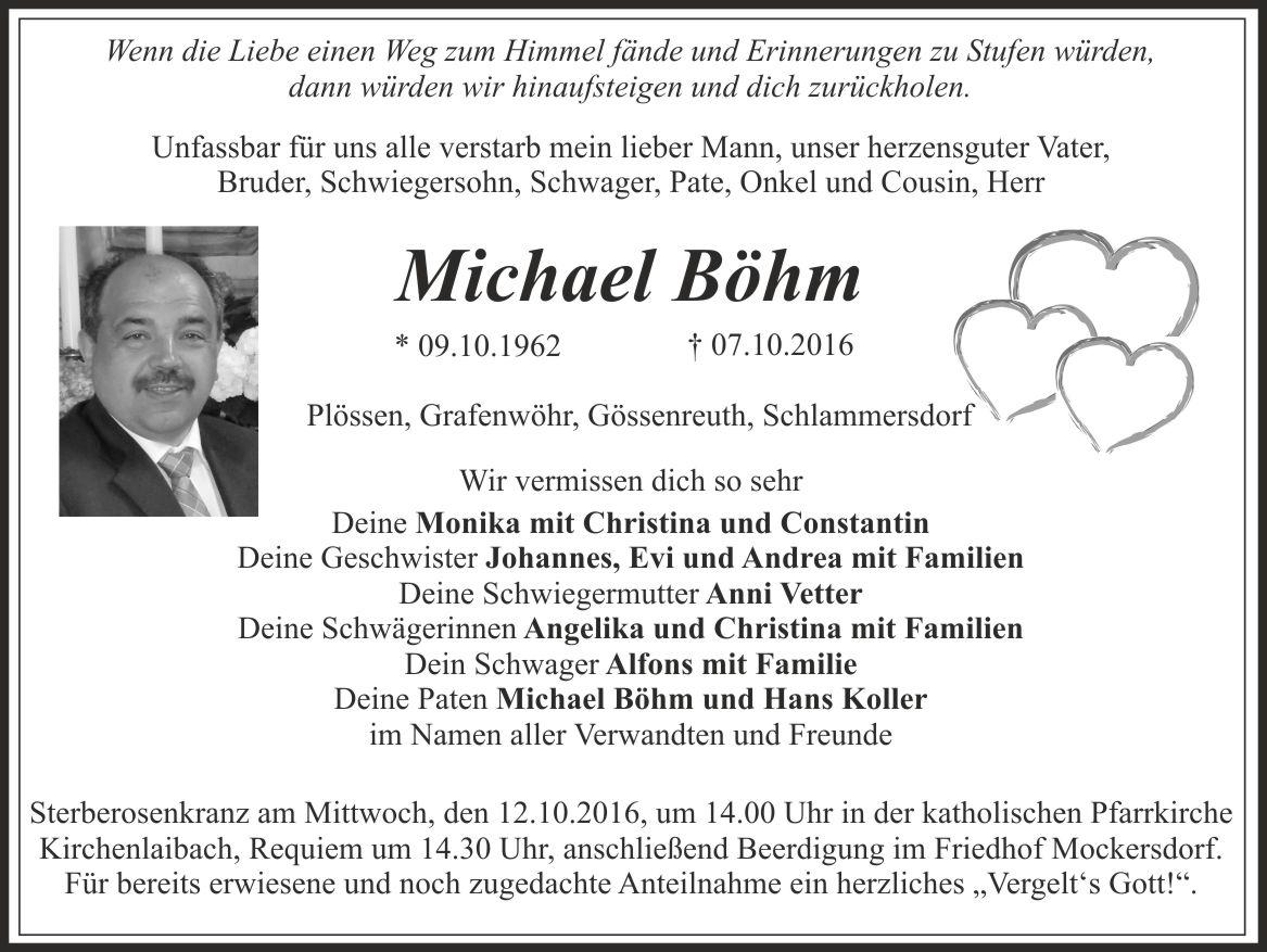 Aussegnung am Montag, den 10.10.2016, um 18.00 Uhr im Friedhof Mockersdorf. Sterberosenkranz am Mittwoch, den 12.10.2016, um 14.00 Uhr in der katholischen Pfarrkirche Kirchenlaibach, Requiem um 14.30 Uhr, anschließend Beerdigung im Friedhof Mockersdorf. Für bereits erwiesene und noch zugedachte Anteilnahme ein herzliches "Vergelt's Gott".