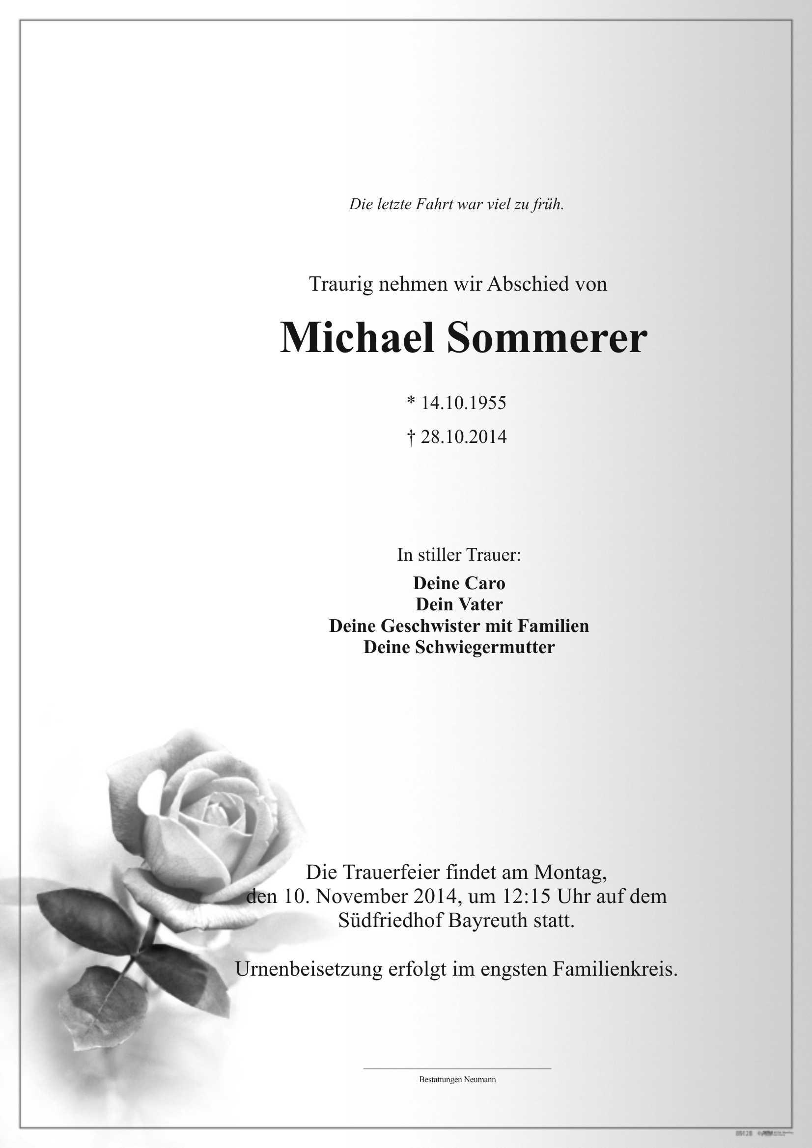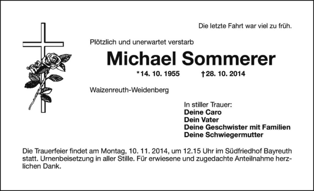 Der Trauergottesdienst findet am Montag, den 10.11.2014, um 12.15 Uhr im Südfriedhof Bayreuth statt. Urnenbeisetzung im engsten Familienkreis. Für alle Anteilnahme bedanken wir uns herzlich.
