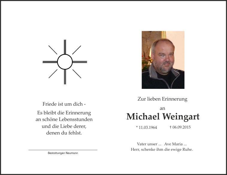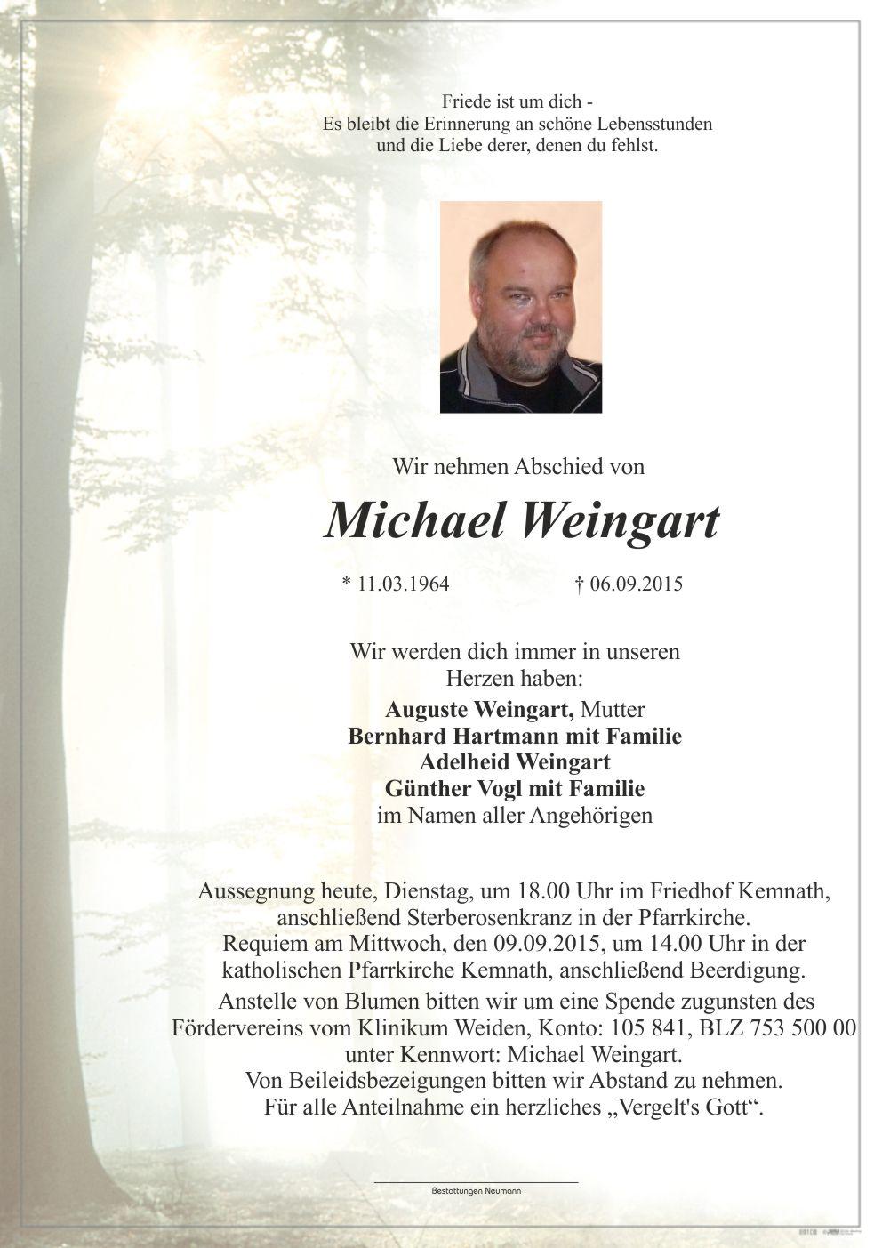 BLZ 753 500 00 unter Kennwort: Michael Weingart. Von Beileidsbezeigungen am Grab bitten wir Abstand zu nehmen. Für alle Anteilnahme ein herzliches „Vergelt‘s Gott“.