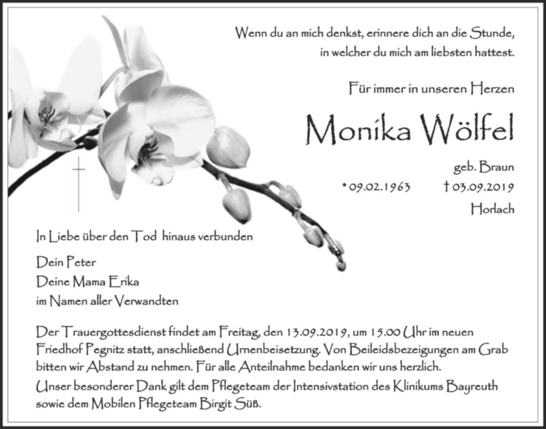 Der Trauergottesdienst findet am Freitag, den 13.09.2019, um 15.00 Uhr im neuen Friedhof Pegnitz statt, anschließend Urnenbeisetzung. Von Beileidsbezeigungen am Grab bitten wir Abstand zu nehmen. Für alle Anteilnahme bedanken wir uns herzlich. Unser besonderer Dank gilt dem Pflegeteam der Intensivstation des Klinikums Bayreuth sowie dem Mobilen Pflegeteam Birgit Süß.
