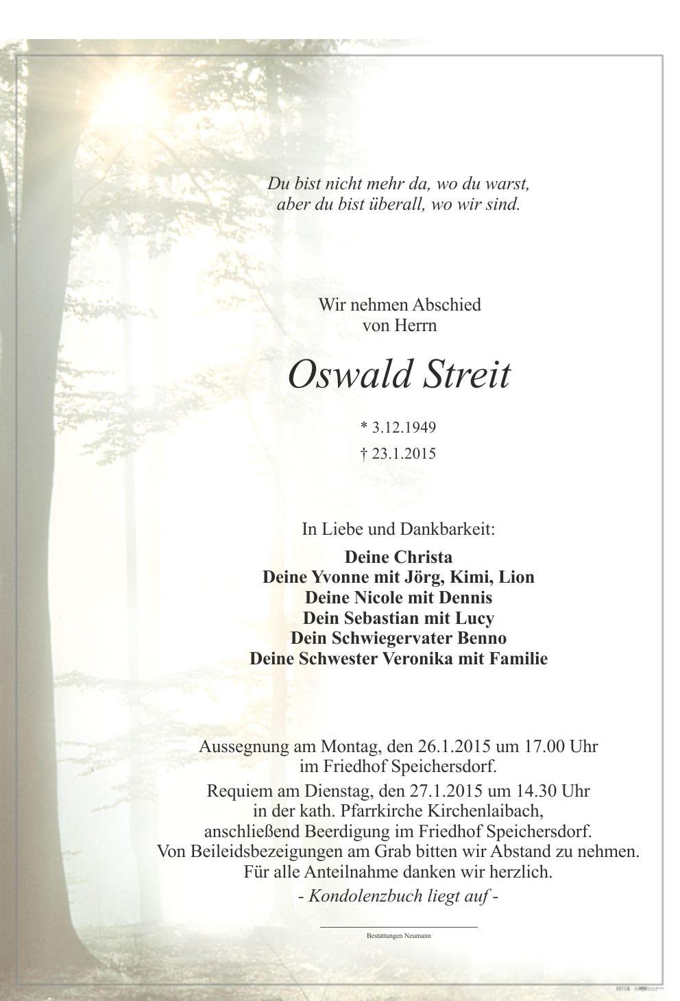 Requiem am Dienstag, den 27.1.2015, um 14.30 Uhr in der kath. Pfarrkirche Kirchenlaibach, anschließend Beerdigung im Friedhof Speichersdorf. Für alle Anteilnahme herzlichen Dank.