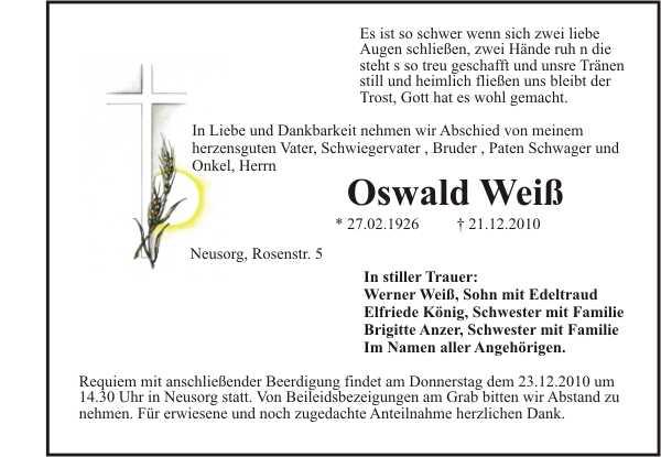 Die Beisetzung findet am Donnerstag, 23.12.2010 um 14:30 Uhr auf dem Friedhof in Neusorg statt.