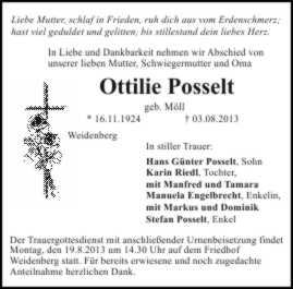 Der Trauergottesdienst mit anschließender Urnenbeisetzung findet Montag, den 19.8.2013 um 14.30 Uhr auf dem Friedhof Weidenberg statt. Für bereits erwiesene und noch zugedachte Anteilnahme herzlichen Dank.
