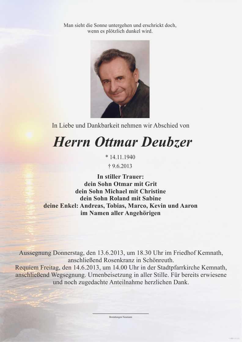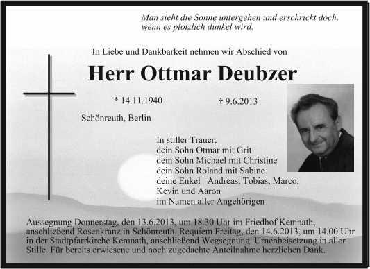 Requiem Freitag, den 14.6.2013, um 14.00 Uhr in der Stadtpfarrkirche Kemnath, anschließend Wegsegnung. Urnenbeisetzung in aller Stille. Für bereits erwiesene und noch zugedachte Anteilnahme herzlichen Dank.