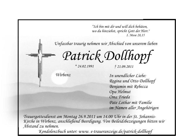 als ich nach meinem Urlaub die Zeitungen aufschlug und unter den Todesanzeigen den Namen meines früheren Schülers Patrick las. Ihnen liebe Familie Dollhopf spreche ich auf diesem Wege meine aufrichtige Anteilnahme aus.