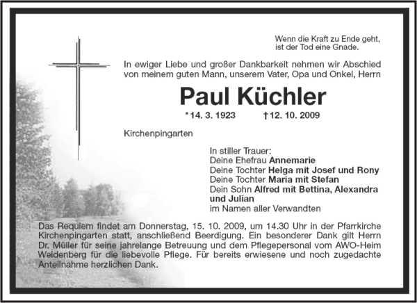 Die Beisetzung findet am Donnerstag, 15.10.2009 um 14:30 Uhr auf dem Friedhof in Kirchenpingarten statt.