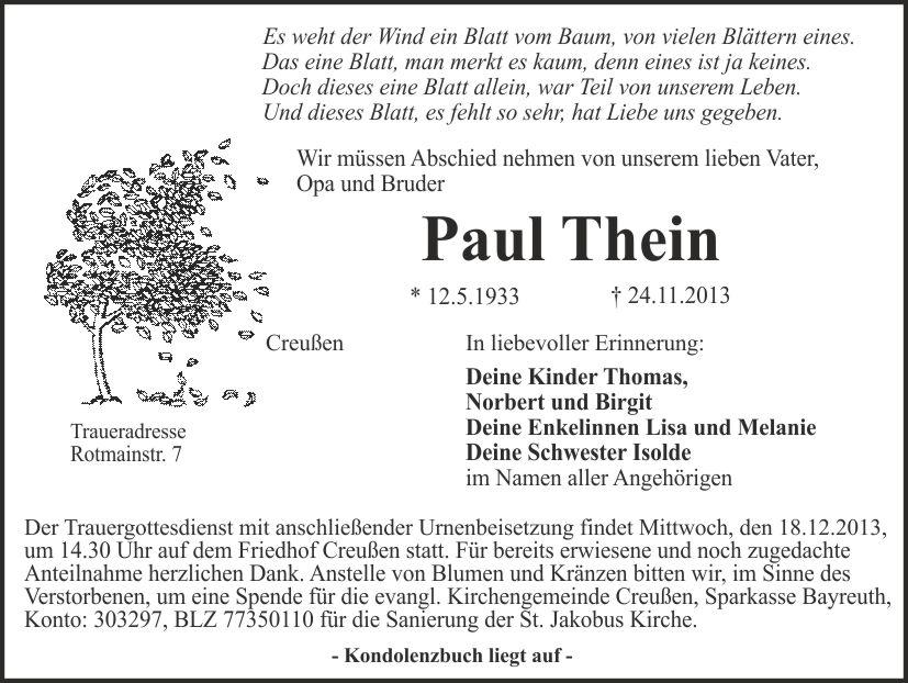 Der Trauergottesdienst mit anschließender Urnenbeisetzung findet Mittwoch, den 18.12.2013, um 14.30 Uhr auf dem Friedhof Creußen statt. Für bereits erwiesene und noch zugedachte Anteilnahme herzlichen Dank. Anstelle von Blumen und Kränzen bitten wir, im Sinne des Verstorbenen, um eine Spende für die evangl. Kirchengemeinde Creußen, Sparkasse Bayreuth, Konto: 303297, BLZ 77350110 für die Sanierung der St. Jakobus Kirche.