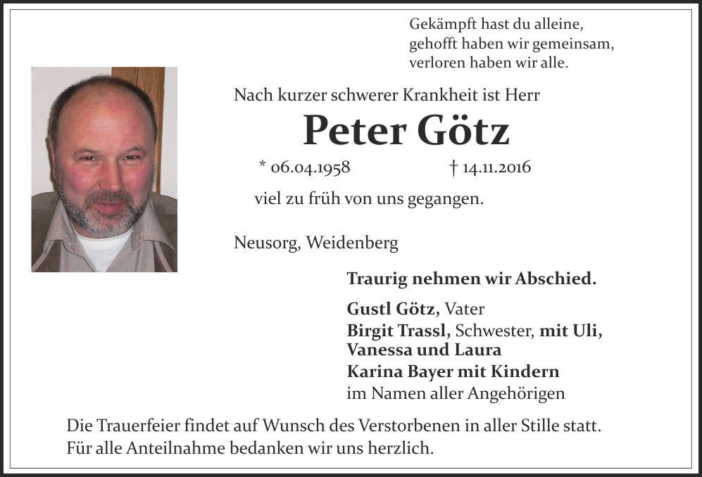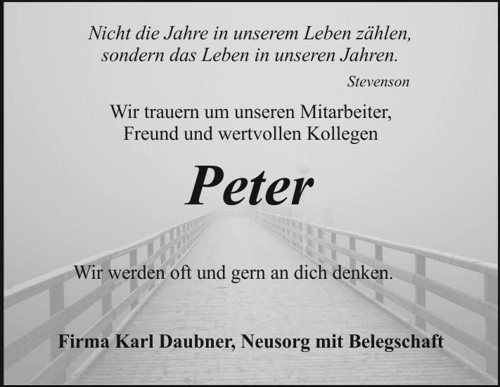 Lieber Peter, danke für die schöne Zeit die wir mit Dir in Bad Steben (Reha) verbringen durften. Schade das wir keine weiteren Treffen mehr haben werden. Ruhe in Frieden! Deine Reha-Freunde Charly, Iris, Manfred, Wolfgang und Jutta