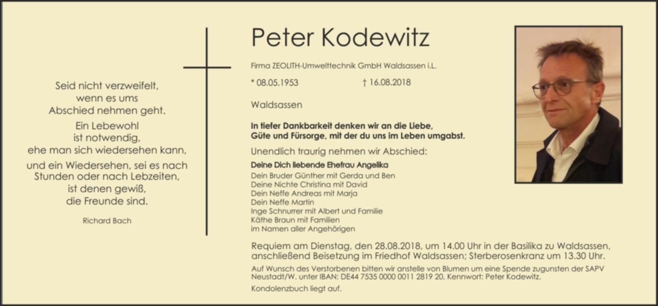 Auf Wunsch des Verstorbenen bitten wir anstelle von Blumen um eine Spende zugunsten der SAPV Neustadt/W. unter IBAN: DE44 7535 0000 0011 2819 20, Kennwort: Peter Kodewitz.