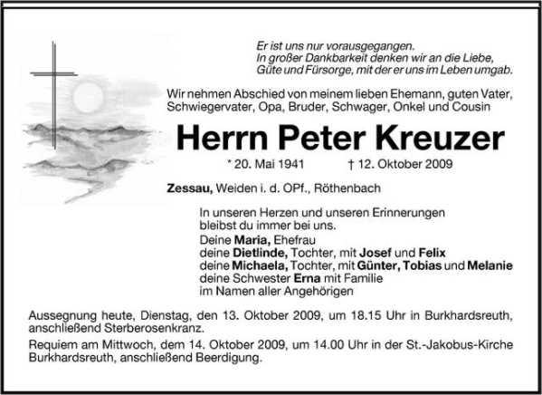 Requiem am Mittwoch dem 14.10.2009 um 14.00 Zhr in der St. Jakobus Kirche in Burkhardsreuth, anschließend Beerdigung.