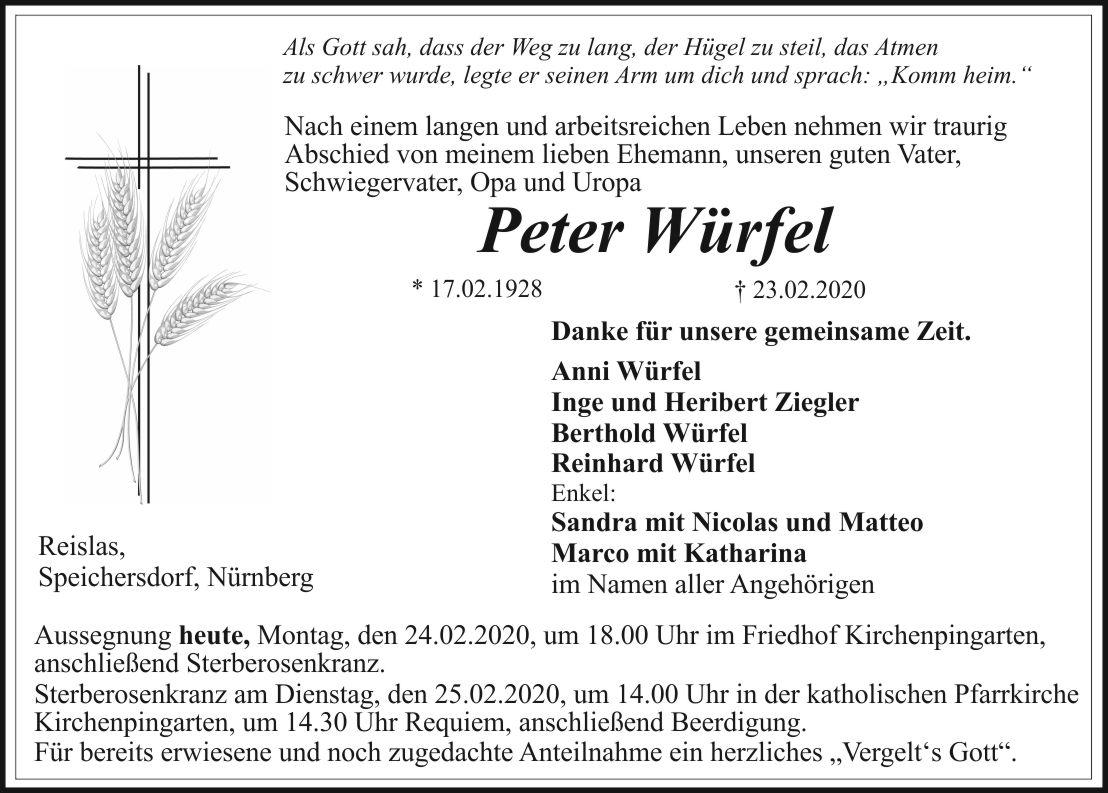 Sterberosenkranz am Dienstag, den 25.02.2020, um 14.00 Uhr in der katholischen Pfarrkirche Kirchenpingarten, um 14.30 Uhr Requiem, anschließend Beerdigung.