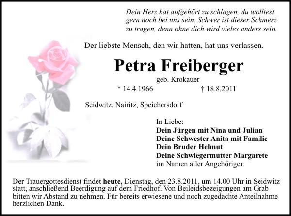 Die Beisetzung findet am Dienstag, 23.08.2011 um 14:00 Uhr auf dem Friedhof in Seidwitz statt.