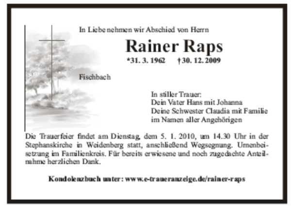 Die Trauerfeier mit anschließener Verabschiedung findet am Dienstag, dem 5.1.2010 um 14.30 Uhr auf dem Friedhof in Weidenberg statt.