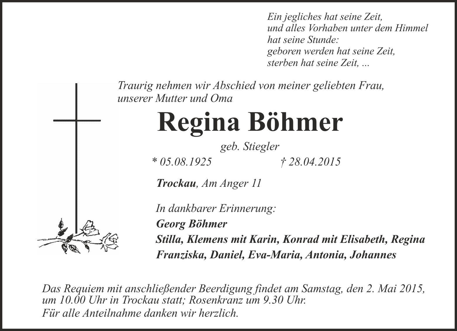 Das Requiem mit anschließender Beerdigung findet am Samstag, den 2.5.2015, um 10..00 Uhr in Trockau statt. Rosenkranz 9.30 Uhr. Für alle Anteilnahme danken wir herzlich.