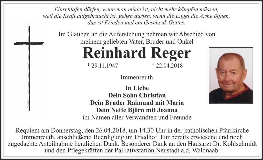 Aussegnung heute, Montag, 23.04.2018, um 18.00 Uhr im Friedhof Immenreuth. Requiem am Donnerstag, den 26.04.2018, um 14.30 Uhr in der katholischen Pfarrkirche Immenreuth, anschließend Beerdigung im Friedhof. Für bereits erwiesene und noch zugedachte Anteilnahme herzlichen Dank. Besonderer Dank an den Hausarzt Dr. Kohlschmidt und den Pflegekräften der Palliativstation Neustadt a.d. Waldnaab.