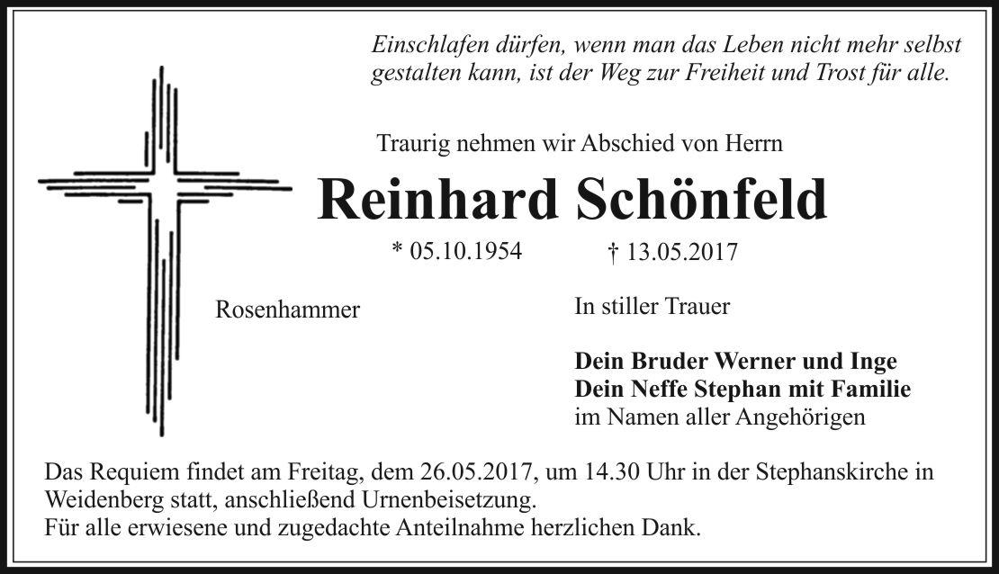 Das Requiem findet am Freitag, dem 26.05.2017 um 14.30 Uhr in der Stephanskirche in Weidenberg statt, anschließend Urnenbeisetzung. Für alle erwiesene und noch zugedachte Anteilnahme herzlichen Dank.