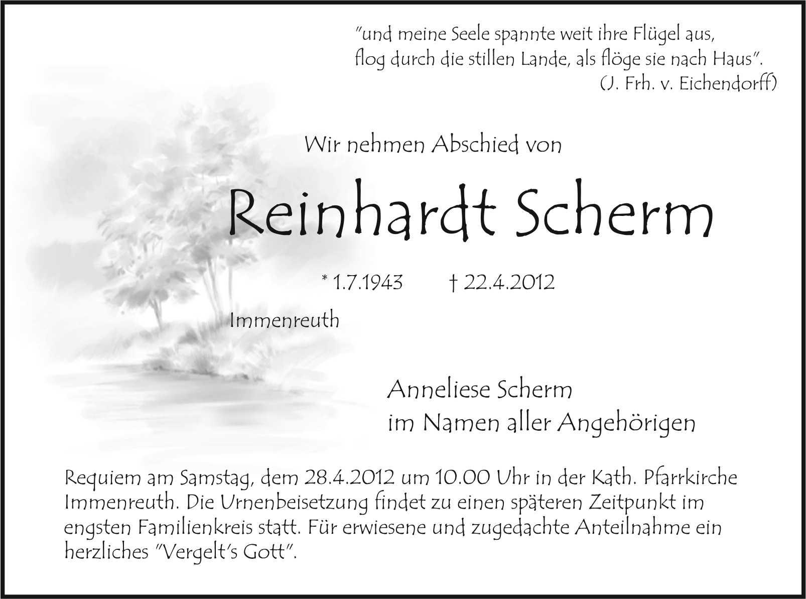 Requiem am Samstag, dem 28.4.2012 um 10.00 Uhr in der Kath. Pfarrkirche Immenreuth. Die Urnenbeisetzung findet zu einen späteren Zeitpunkt im engsten Familienkreis statt. Für erwiesene und zugedachte Anteilnahme ein herzliches "Vergelt's Gott".