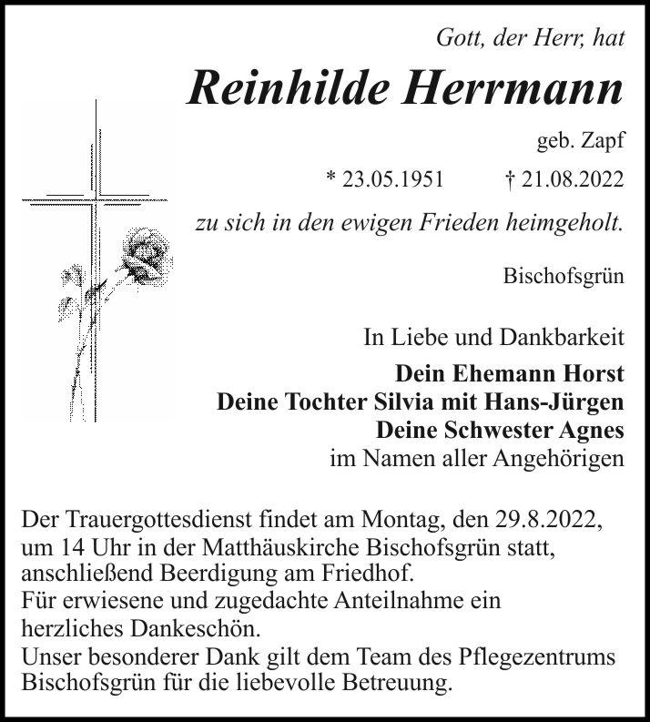 um 14 Uhr in der Matthäuskirche Bischofsgrün statt, anschließend Beerdigung am Friedhof.