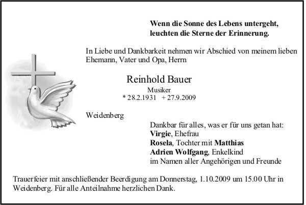 Die Beisetzung findet am Donnerstag, 01.10.2009 um 15:00 Uhr auf dem Friedhof in Weidenberg statt.